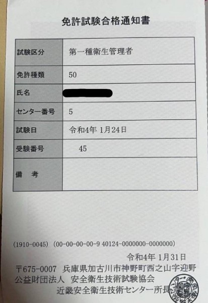 第一種衛生管理者試験に合格されました!(^^)!