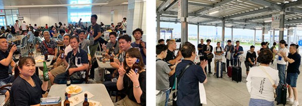 お土産をたっぷり買い込み、搭乗の待ち時間に気づけば宴会が始まりました。最後の宴です。
